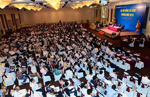 Cổ đông nhỏ, lẻ mua cổ phiếu đơn thuần để kỳ vọng cuối năm nhận về khoản lãi bằng tiền mặt. Trong ảnh: Đại hội cổ đông Sacombank năm 2015. Ảnh: NS