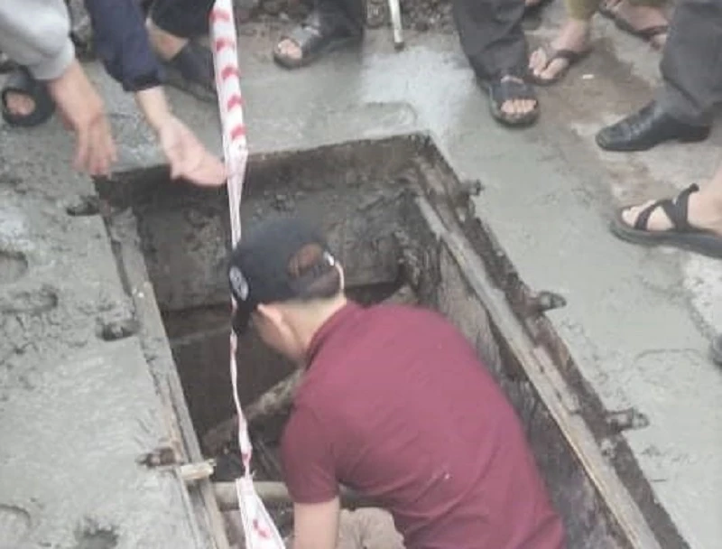 Người đi đường xuống hố ga đưa chị X. đi cấp cứu. Ảnh: ND