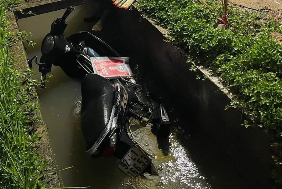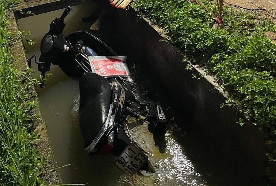 Khi đến đoạn đường thuộc thôn Phú Hưng (xã Tam Xuân 1), xe máy bất ngờ bị rơi xuống mương nước.