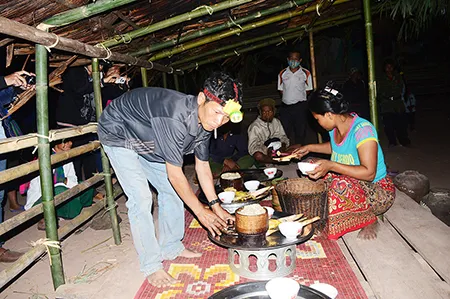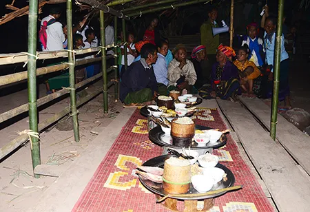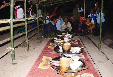 Mâm lễ được chuẩn bị bao gồm rượu hiêng, thịt gà nấu với đọt non, xôi, một ít lúa gạo, cá, ngọn cây đoác…