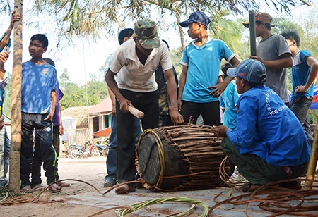 Chiếc trống do những người thanh niên khéo léo có kinh nghiệm thực hiện.