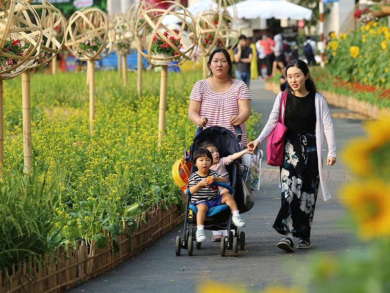 Cả nhà rủ nhau xuống Hội chợ hoa xuân Phú Mỹ Hưng (quận 7, TP.HCM) vui chơi Tết. Ảnh: HOÀNG GIANG