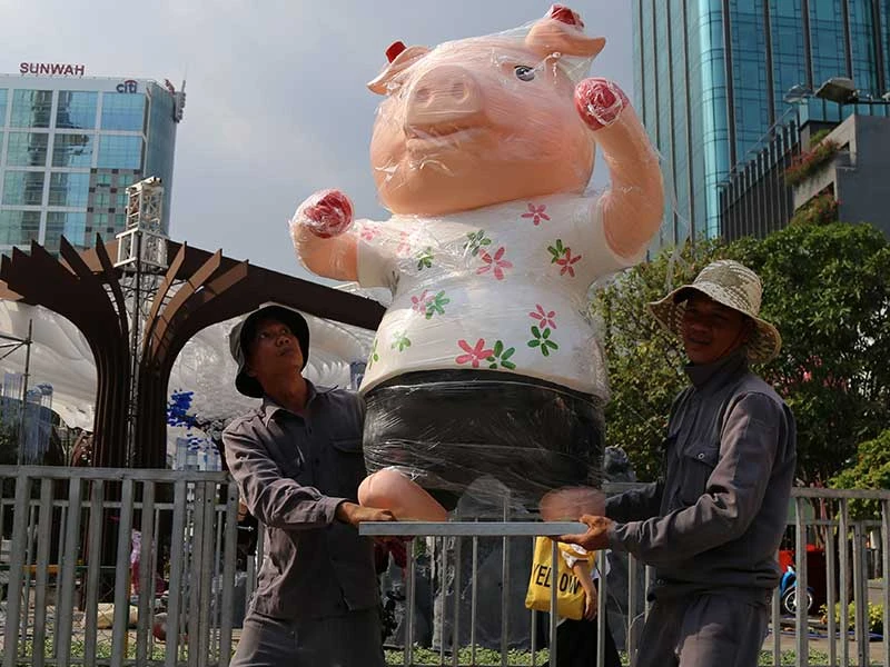 Năm Kỷ Hợi nên linh vật năm nay là những gia đình heo được thiết kế nhiều màu sắc thể hiện tinh thần lạc quan, yêu đời. Nghệ nhân Văn Tòng, người luôn “chủ xị” cho mảng linh vật ở đường hoa hằng năm, chia sẻ: “Hơn 20 linh vật với con lớn nhất 2,2 m và nhỏ nhất khoảng 60-70 cm sẽ xuất hiện ở đường hoa”.
