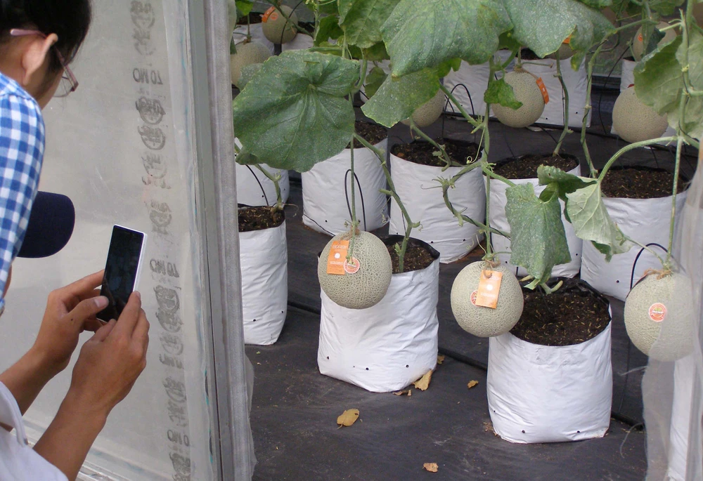 Những trái dưa lưới treo lạ lẫm, đẹp mắt được lưu lại trong điện thoại của du khách.