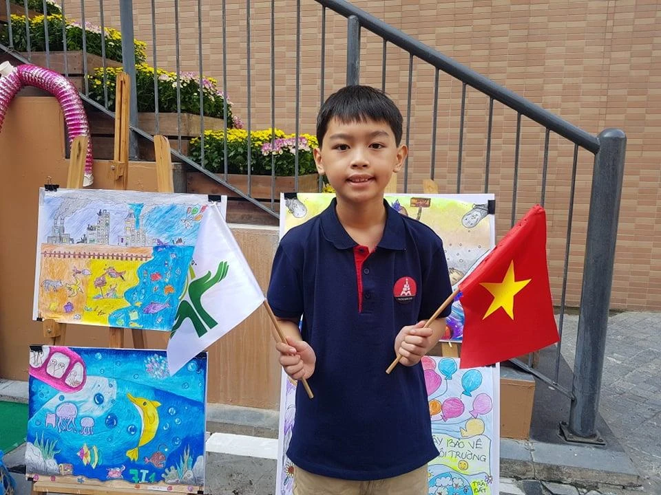 "Lễ khai giảng không có bóng bay nhưng em không buồn. Chúng em có tranh của các bạn vẽ để truyền tải thông điệp bảo vệ môi trường", em Phong, học sinh lớp 3B, Trường Marie Curie. Ảnh: AH