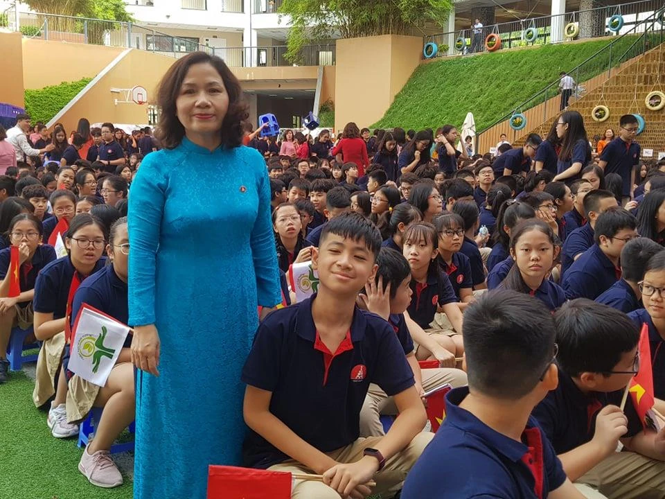 Cô và trò Trường Marie Curie trong lễ khai giảng năm học mới. Ảnh: AH