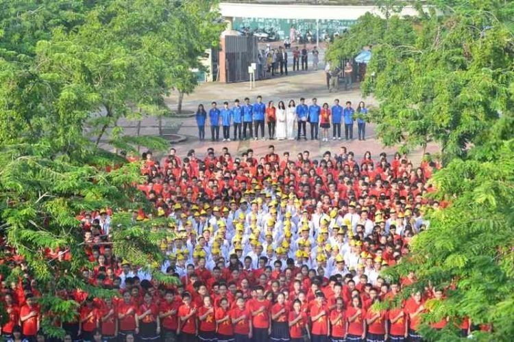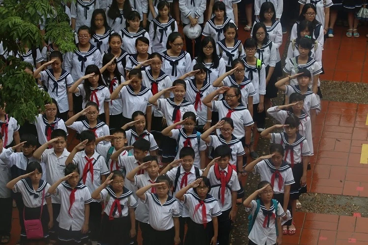 Tại trường Lương Thế Vinh (Hà Nội), lễ khai giảng chỉ diễn ra trong đúng 30 phút. Các học sinh trong trường khoác trên mình những chiếc áo cờ đỏ sao vàng, xếp thành hình cờ Tổ quốc thể hiện tình yêu quê hương, đất nước, biển đảo Việt Nam.