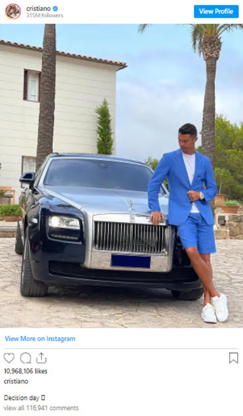 Đêm qua (18-7), siêu sao 36 tuổi người Bồ Đào Nha Cristiano Ronaldo đã đưa lên mạng xã hội Instagram hình ảnh đang mặc áo xanh nhạt tạo dáng trên chiếc xe Rolls-Royce siêu sang kèm chú thích khó hiểu “Ngày quyết định”.