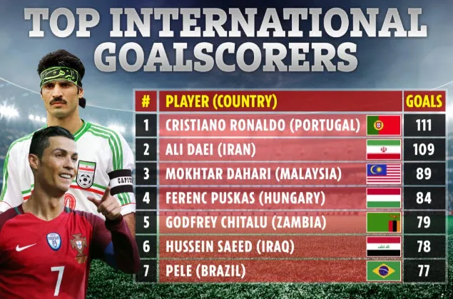 Top các cầu thủ ghi bàn nhiều nhất cho đội tuyển quốc gia. ẢNH: THE SUN