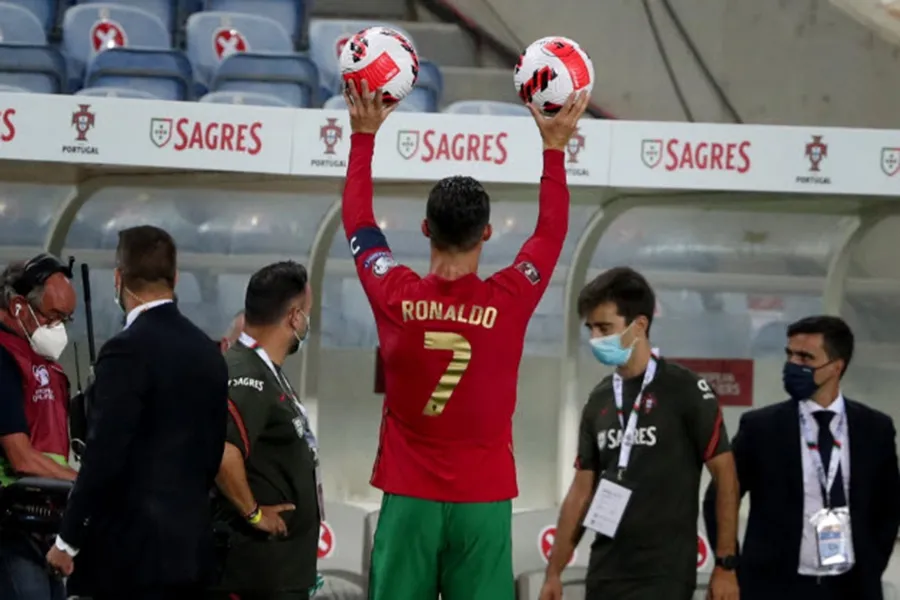 Ronaldo lấy hai quả bóng về nhà ăn mừng kỷ lục. ẢNH: GETTY