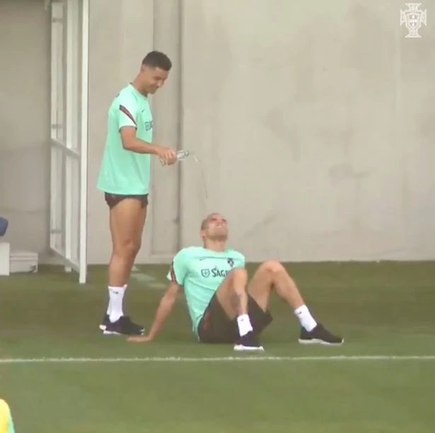 Theo đó, trong buổi tập của tuyển Bồ Đào Nha, đội trưởng Ronaldo, 36 tuổi đã có hành động “chơi khăm” Pepe, 38 tuổi. Pepe đang ngồi "phơi nắng" trên sân tập thì bị Ronaldo phát hiện ra.