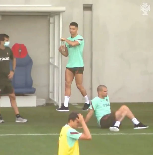 Lúc này, Ronaldo cầm theo một chai nước rồi nhìn về phía hai trợ lý HLV với nụ cười nhếch mép đầy ranh ma. Sau đó, Ronaldo lập tức mở chai nước rồi tưới thẳng lên đầu Pepe.