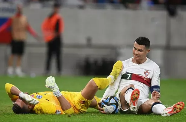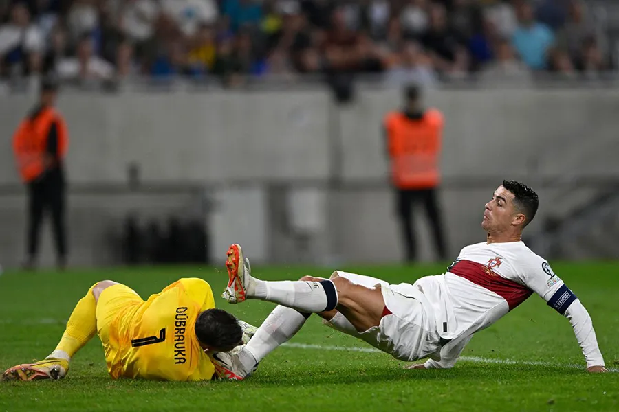 Ronaldo đã đối đầu với đồng đội cũ tại MU là thủ môn Martin Dubravka của Slovakia ở trận này. CR7 đã may mắn tránh được thẻ đỏ trực tiếp sau khi dùng “đinh giày đánh bóng cái đầu” của Martin Dubravka trong trận đấu vòng loại Euro 2024 giữa Bồ Đào Nha và Slovakia.