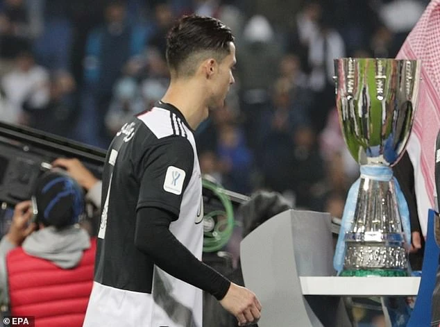 Ronaldo thất vọng đi qua chiếc cúp. Ảnh: EPA