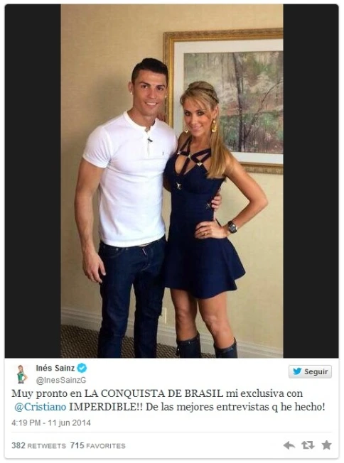 Ines Sainz - phóng viên người Mexico, vừa háo hức khoe trên trang cá nhân bức ảnh thân mật bên ngôi sao Cristiano Ronaldo của Bồ Đào Nha tại Brazil. “Anh ấy rất thân thiện. Ronaldo chẳng hề khó chịu khi buổi phỏng vấn kéo dài hơn so với dự kiến. Trong cuộc trò chuyện, chúng tôi nói, cười đùa rất nhiều”, Sainz kể với các fan trên Twitter.