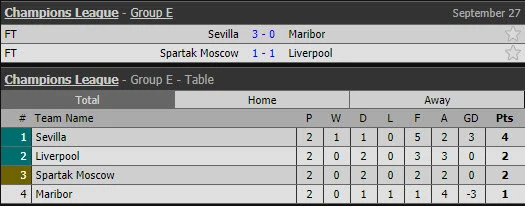 Ở trận đấu còn lại của bảng, CLB của Tây Ban Nha, Sevilla thắng dễ Maribor 3-0 trên sân nhà. Hiện cục diện của bảng này khá phức tạp và khó lường, Sevilla đang dẫn đầu với 4 điểm, theo sau là Spartak Moscow và Liverpool cùng có 2 điểm, trong khi đó, Maribor xếp cuối bảng với 1 điểm.