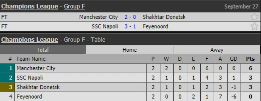 Với kết quả này, cục diện bảng F vẫn trở nên khó lường hơn. Man City dẫn đầu với 6 điểm tuyệt đối, Shakhtar Donetsk và Napoli cùng có 3 điểm, trong khi Feyenoord chưa có điểm nào.