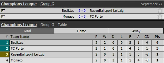 Ở bảng G, Besiktas của Thổ Nhĩ Kỳ thắng gã nhà giàu mới nổi của nước Đức RasenBallsport Leipzig 2-0, còn Monaco bất ngờ thua Porto đến 0-3 trên sân nhà. Ở bảng này, Besiktas dẫn đầu với 6 điểm, Porto xếp thứ hai với 3 điểm. hai đội Monaco và Leipzig xếp ở hai vị trí cuối với chỉ 1 điểm.