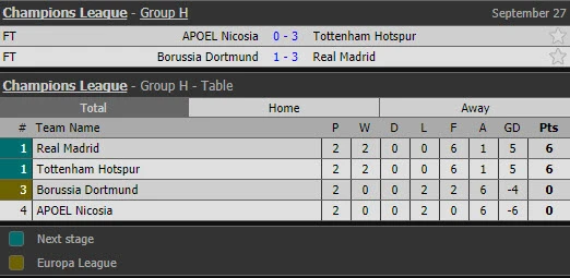 Với kết quả này, cục diện bảng H đã phân chia rõ ràng chỉ sau 2 vòng đấu. Real Madrid và Tottenham chia nhau hai vị trí dẫn đầu với 6 điểm tuyệt đối, còn Dortmund và Apoel Nicosia cùng xếp cuối bảng không có điểm nào sau 2 trận.