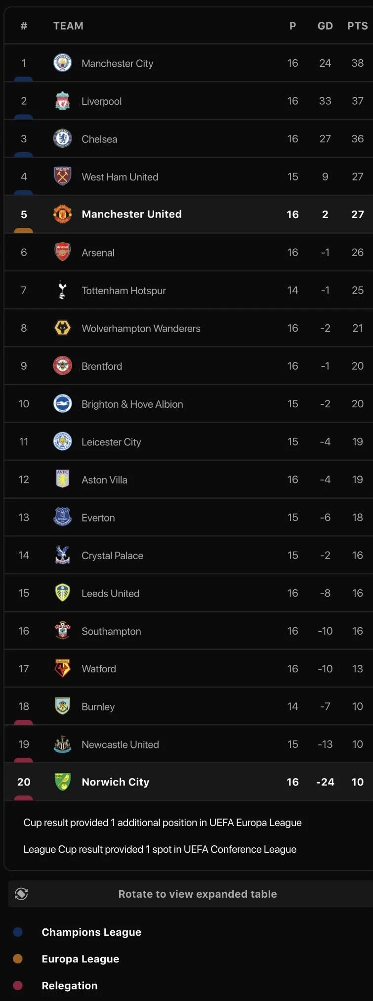Thắng trận nhọc nhằn với tỉ số 1-0 trước Norwich, Manchester United vươn lên vị trí thứ 5 trên bảng xếp hạng Premier League. Đội chủ sân Old Trafford có cùng 27 điểm với đội xếp thứ tư West Ham nhưng thua hiệu số và còn đá nhiều hơn 1 trận.