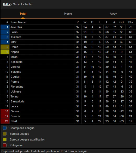 Thoát thua trong gang tấc, Juventus giữ vững ngôi đầu Serie A sau vòng 32 với 76 điểm. “Lão bà” hơn đội xếp thứ hai Lazio 8 điểm và hơn đội xếp thứ ba Atalanta 9 điểm khi Serie A chỉ còn 6 vòng nữa là kết thúc.