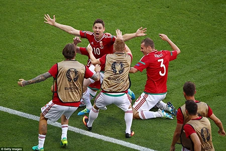Niềm vui của các cầu thủ Hungary khi Gera ghi bàn đẹp mắt mở tỉ số trận đấu.