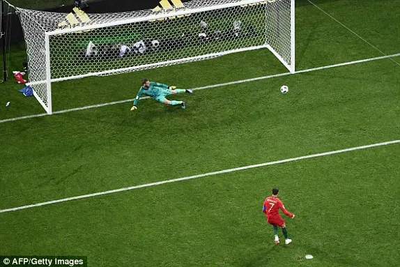 Phút 88, từ quả đá phạt trực tiếp, Ronaldo tung cú dứt điểm tạo nên tuyệt phẩm vào góc cao khiến De Gea chỉ biết đứng nhìn bóng vào lưới san bằng tỉ số 3-3 cho Bồ Đào Nha.