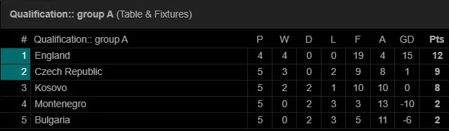 Như vậy, sau 5 lượt trận, Anh dẫn đầu bảng với 12 điểm điểm tuyệt đối (Anh mới đá 4 trận). Tuyển Anh quá mạnh ở bảng này và gần như sẽ giành suất đầu tiên tham dự VCK Euro 2020. Suất còn lại là cuộc cạnh tranh giữa Czech (9 điểm) và Kosovo (8 điểm).