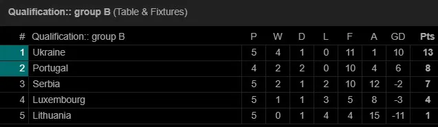 Trận đấu còn lại của bảng này Luxembourg thua Serbia 1-3. Sau 5 lượt trận, Ukraine dẫn đầu bảng với 13 điểm, Bồ Đào Nha đứng thứ hai với 8 điểm (4 trận), Serbia có 7 điểm, Luxembourg 4 điểm và Lithuania 1 điểm.
