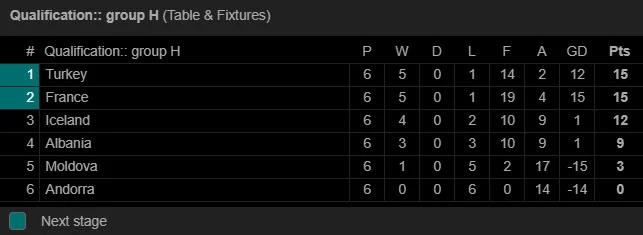 Sau 6 lượt trận, Thổ Nhĩ Kỳ dẫn đầu bảng với 15 điểm, Pháp xếp thứ hai cũng có 15 điểm nhưng thua hiệu số. Iceland sau trận thua sốc Albania tụt lại phía sau với 12 điểm. Albania có 9 điểm, Moldova 3 điểm và Andorra chưa có điểm nào.