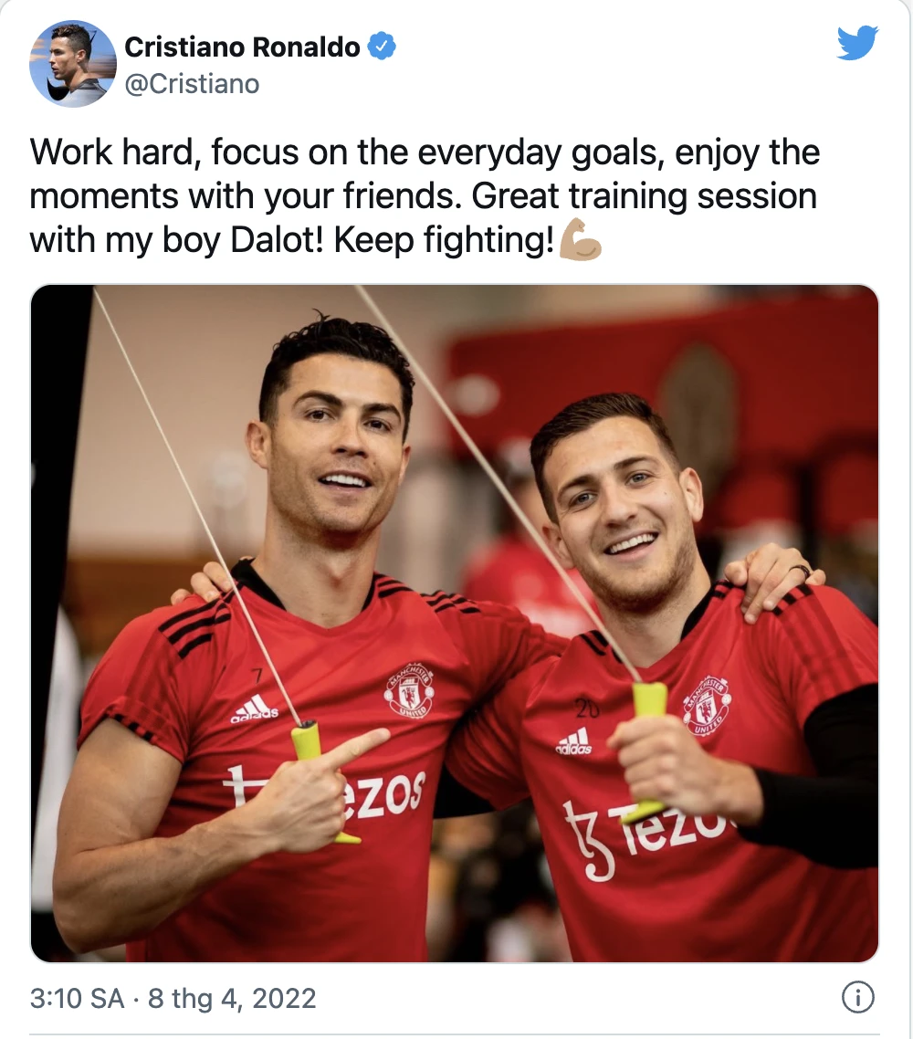 Ronaldo đã đăng bức ảnh anh khoác vai đồng đội ở MU và tuyển Bồ Đào Nha Diogo Dalot lên mạng xã hội cá nhân của anh, kèm chia sẻ: “Hãy làm việc chăm chỉ, tập trung vào những mục tiêu hàng ngày và tận hưởng những giây phút bên bạn bè. Buổi tập tuyệt vời với chàng trai Dalot của tôi! Hãy tiếp tục chiến đấu!”.