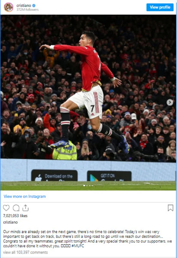 Cristiano Ronaldo chia sẻ dòng trạng thái trên Instagram: “Tâm trí của chúng tôi đặt vào trận đấu tiếp theo, không có thời gian để ăn mừng. Chiến thắng hôm nay rất quan trọng để Manchester United trở lại đúng hướng. Vẫn còn một chặng đường dài phía trước cho đến khi chúng tôi đến đích….