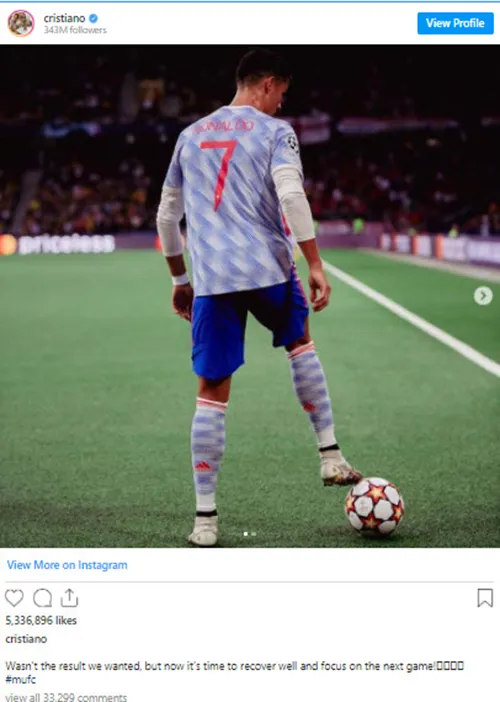 Tuy nhiên, Ronaldo đã tỏ ra rất bình tĩnh sau trận đấu. Ronaldo chia sẻ ngắn gọn trên Instagram: “Đó không phải là kết quả Manchester United mong muốn. Nhưng bây giờ đã đến lúc chúng tôi hồi phục và tập trung cho trận đấu tiếp theo”.