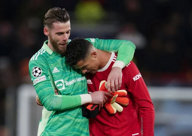 Thủ môn De Gea, cầu thủ xuất sắc nhất trận đấu với hàng loạt pha cứu thua xuất thần chia vui với Ronaldo. ẢNH: AP