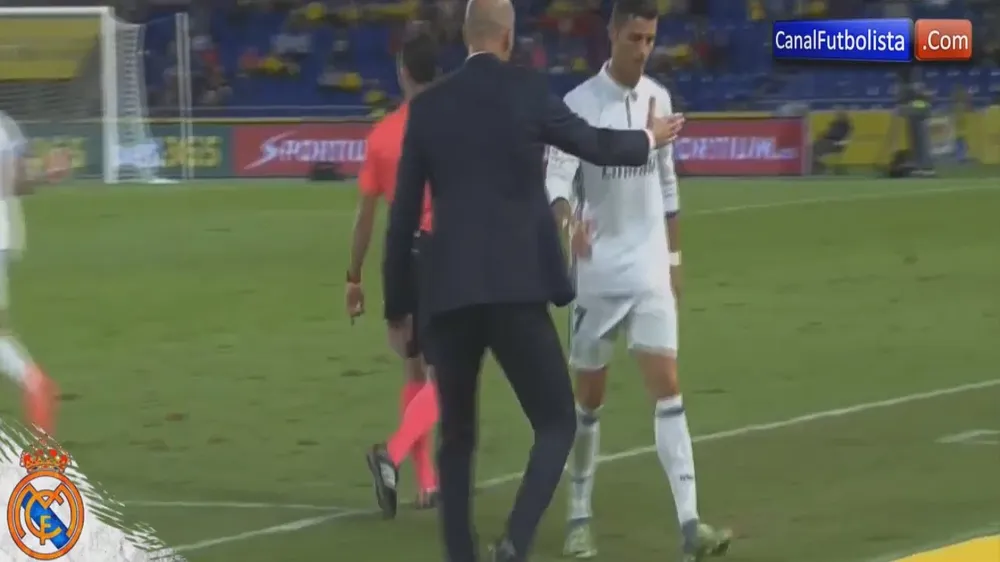 Trong trận hòa Las Palmas 2-2 tối qua (24-9) Ronaldo bị thay ra ở phút 72 lúc Real đang dẫn 2-1. Khi ra ngoài đường biên, Ronaldo thực hiện động tác bắt tay nhưng có thái độ không tốt với ông thầy Zidane, anh tỏ vẻ khó chịu và không nhìn mặt thầy.