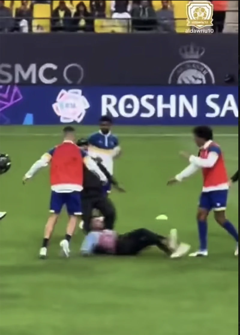 Trong lúc Ronaldo khởi động trước trận đấu, một cổ động viên đã chạy vào sân với hy vọng được chạm vào cầu thủ từng 5 lần vô địch Champions League và giành 5 Quả bóng vàng thế giới. Nhưng khi chạy đến gần Ronaldo và các ngôi sao khác của Al Nassr, anh ta bị trượt chân lao thẳng vào CR7.