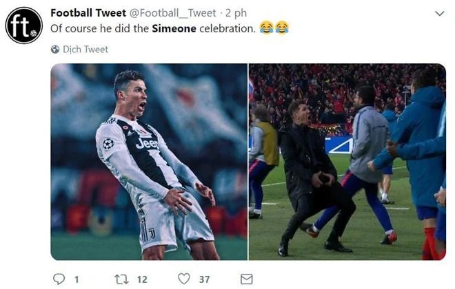 “Tiền đạo của “lão phu nhân” ăn mừng theo cách Diego Simeone”, Twitter Football Tweet châm chọc. Ở trận lượt đi trên sân Wanda Metropolitiano, HLV Atletico Simeone có pha ăn mừng chiến thắng phản cảm nhưng may mắn thoát án phạt từ UEFA.