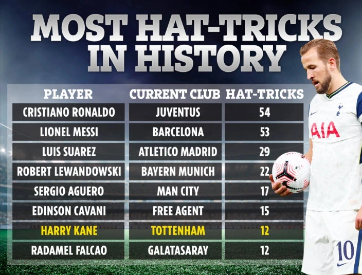 Trong khi đó, người đứng thứ ba là Luis Suarez mới có 29 hat-trick. Trong danh sách này còn có Robert Lewandowski, Sergio Aguero, Edinson Cavani, Harry Kane và Radamel Falcao.