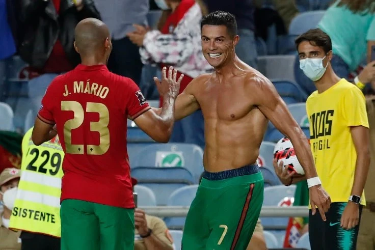 Ở phút bù giờ thứ 6, Joao Mario thực hiện một quả tạt tương tự và Ronaldo đánh đầu ấn định 2-1 cho Bồ Đào Nha. Tuy nhiên, Ronaldo đã phải trả giá đắt vì chiếc thẻ vàng do cởi áo ăn mừng kỷ lục. Anh từng nhận một thẻ vàng ở trận hòa 3-3 trước tuyển Serbia và không thể góp mặt trong trận làm Azerbaijan ở lượt trận tiếp theo vào ngày 7-9.