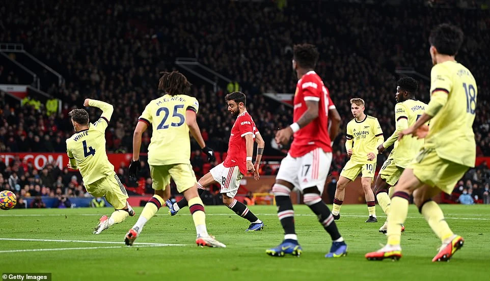 Giành quyền kiểm soát bóng lên đến 58%, nhưng phải đến những phut cuối hiệp một “quỷ đỏ” mới có được bàn gỡ do công của Bruno Fernandes. Từ đợt tấn công bên cánh trái, tiền vệ Fred có đường căng ngang trong vòng cấm, tạo cơ hội cho Bruno dứt điểm một chạm, giúp MU gỡ hòa 1-1 ở phút 44.