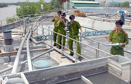 Nhiều đại biểu kiến nghị cần có những hình thức chế tài đủ mạnh như đình chỉ hoạt động đối với các cơ sở gây ô nhiễm nhiều lần. Trong ảnh: Lực lượng chức năng đang khám nghiệm hiện trường một vụ xả nước thải ra sông. Ảnh: CTV