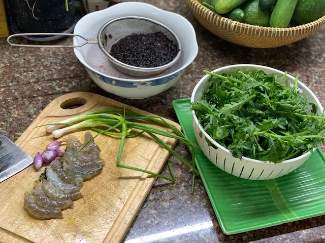 Để nấu bát canh rong biển thật đơn giản. Chỉ rửa thật sạch mớ mứt trên chiếc rây mịn, giống việc rây nhặt những tai yến còn sót lông măng và sạn cát. Sau đó để ráo, kèm một ít rau cải tần ô vào mùa, một ít tôm thẻ lột vỏ, bỏ đầu, lấy chỉ, dùng mặt dao đập dẹp chú tôm thẻ, ướp chút hành tím băm và nước mắm thủ công nhà làm.