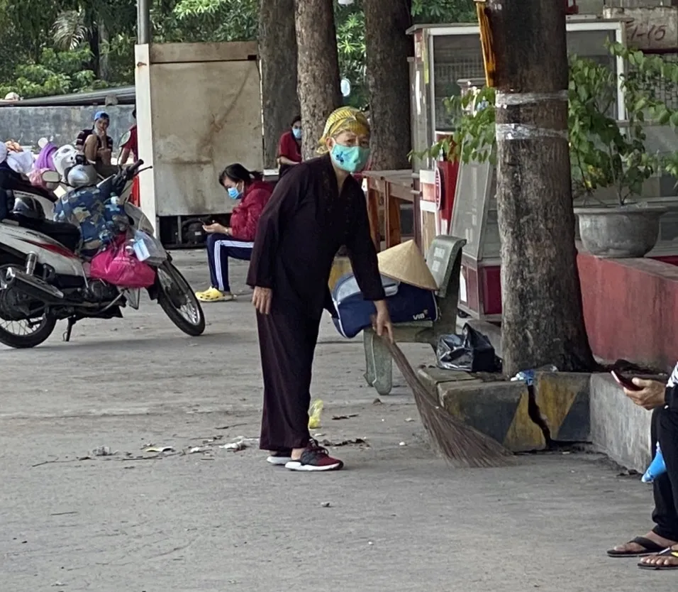 Khi được quán cơm tặng phần cơm từ thiện, bà Tứ run run cảm ơn đón nhận. Sau khi ăn xong, bà cầm chổi giúp các nhân viên dọn dẹp như một hành động trả ơn.