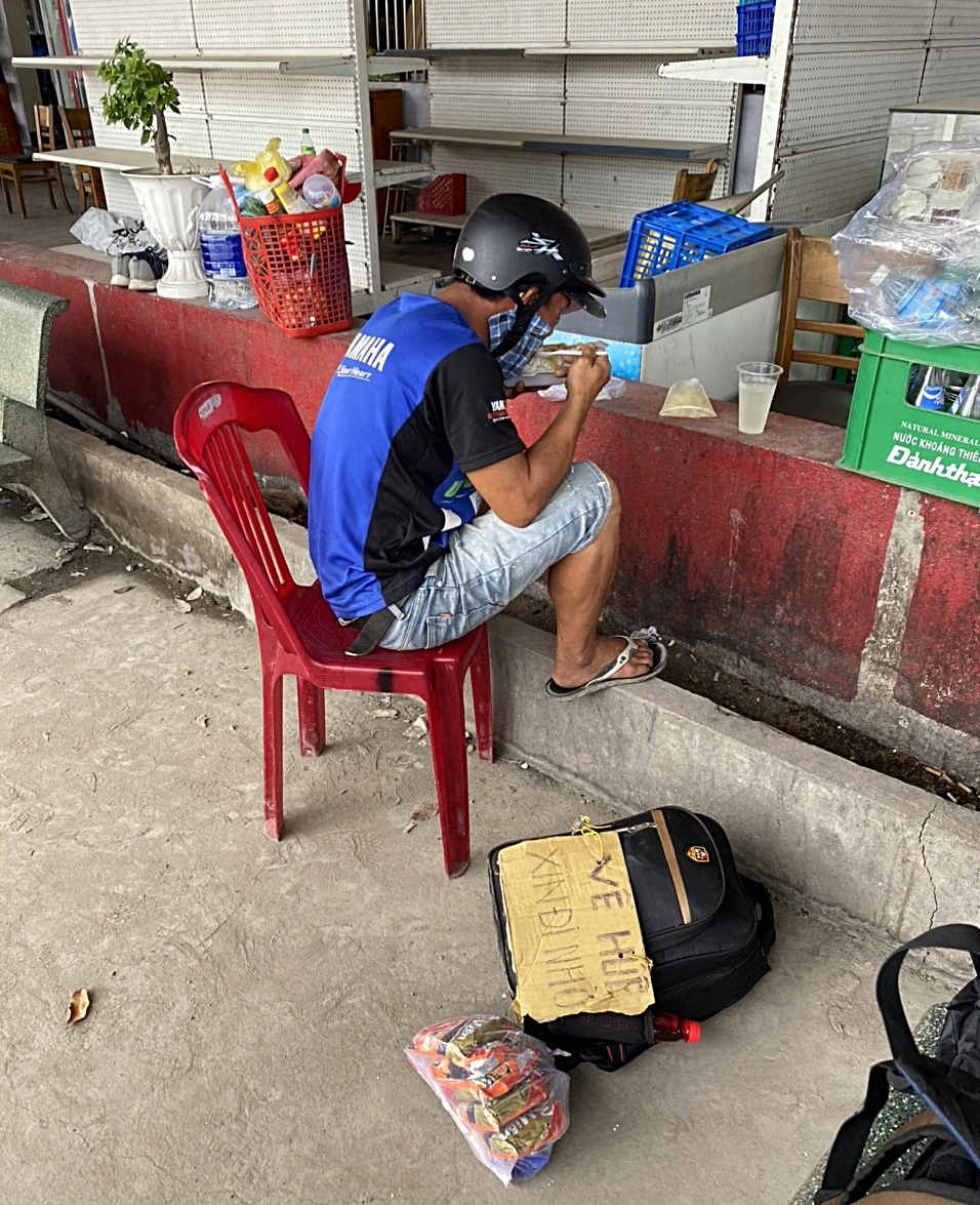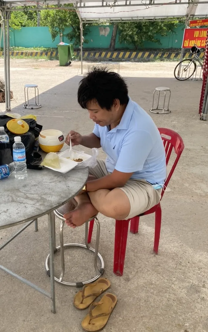 Sau khi khai báo hành trình khó tin hơn một tuần qua của mình, anh Tám xin phép vào quán cơm Hưng Thịnh 2 gần đó mượn tô và xin nước sôi, định lấy 2 gói mì mang theo ra nấu ăn. May mắn là nhân viên quán đa tặng anh một hộp cơm từ thiện.