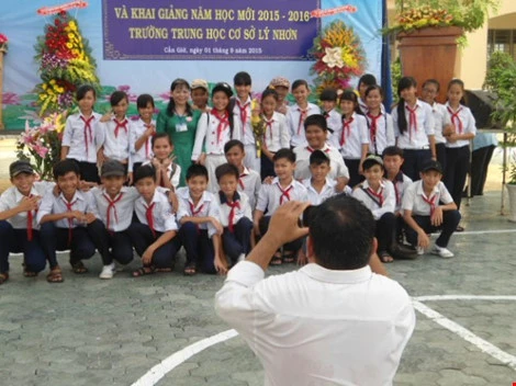 Thầy và trò trường THCS Lý nhơn, Cần Giờ chụp hình trong ngày khánh thành trường, tháng 9/2015. Ảnh: Hà Phượng