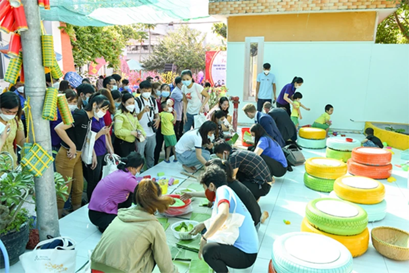 Các em nhỏ và thầy cô trường mầm non Ngôi Sao Nhỏ tham gia hội thi trang trí mai đào và gói bánh chưng bánh tét