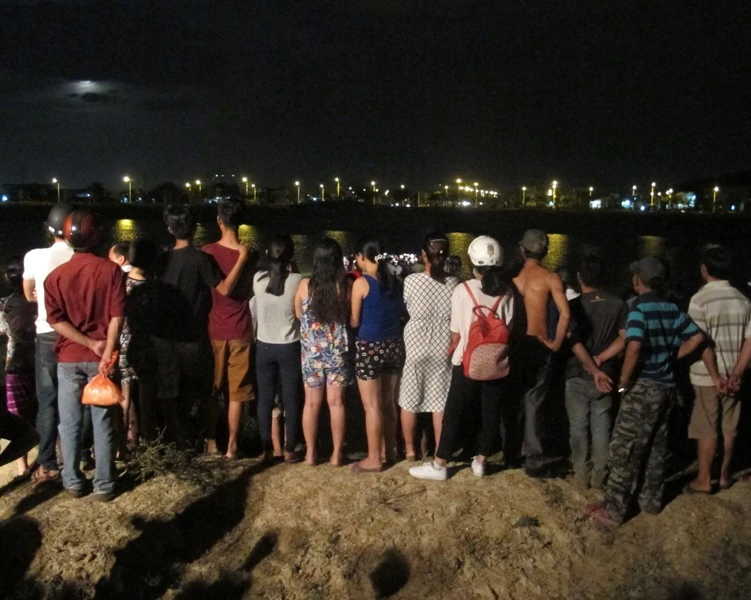 Người dân đứng xem lực lượng cứu hộ vớt thi thể bé M.A