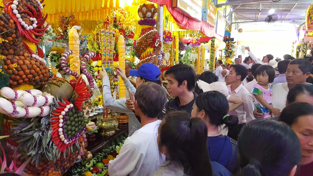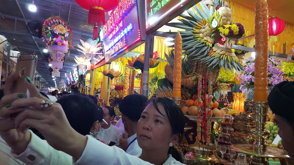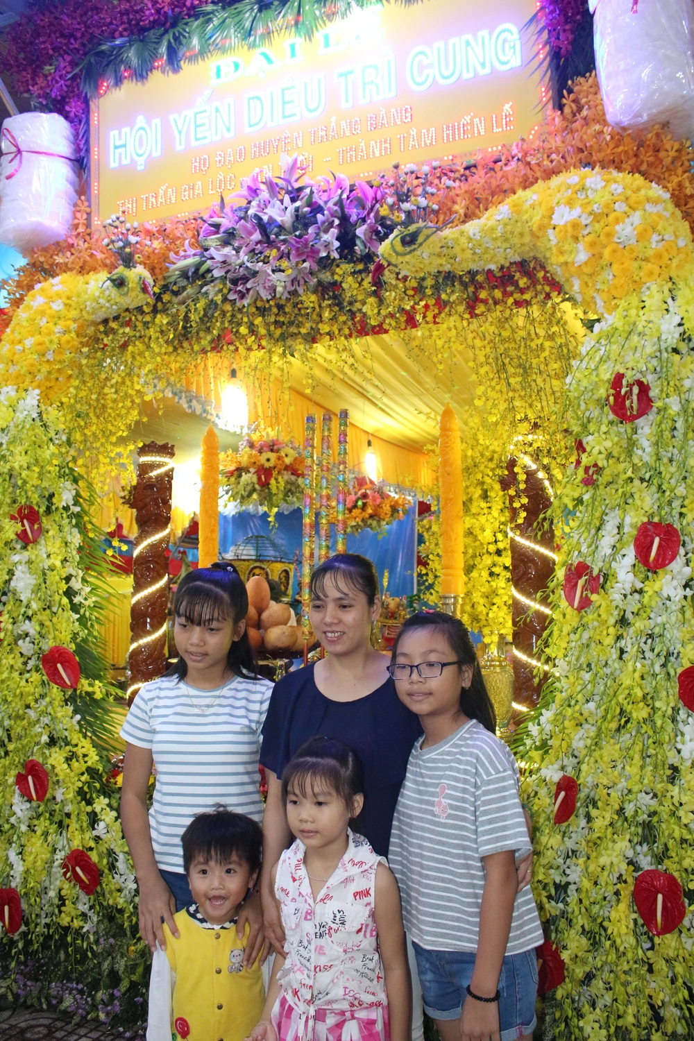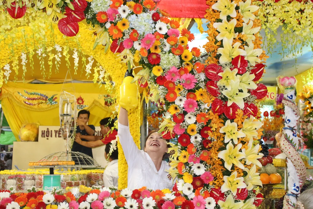 Cổng hoa rực rỡ dâng lễ của tín đồ huyện Trảng Bàng, Tây Ninh.