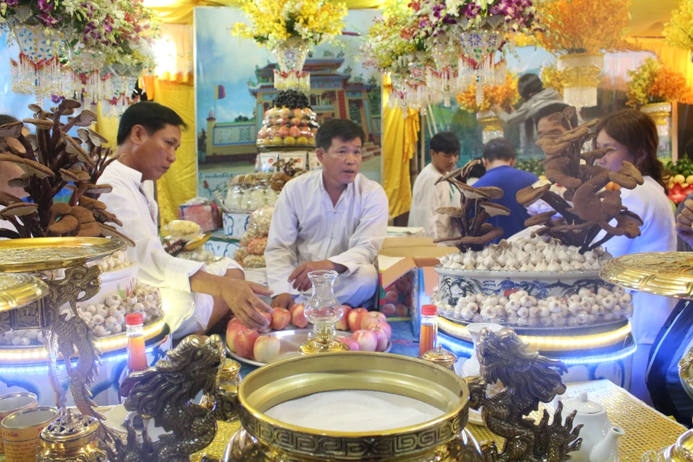 Tín đồ đến từ đảo Lý Sơn đang bày lễ với đặc sản tỏi và nấm Linh Chi.