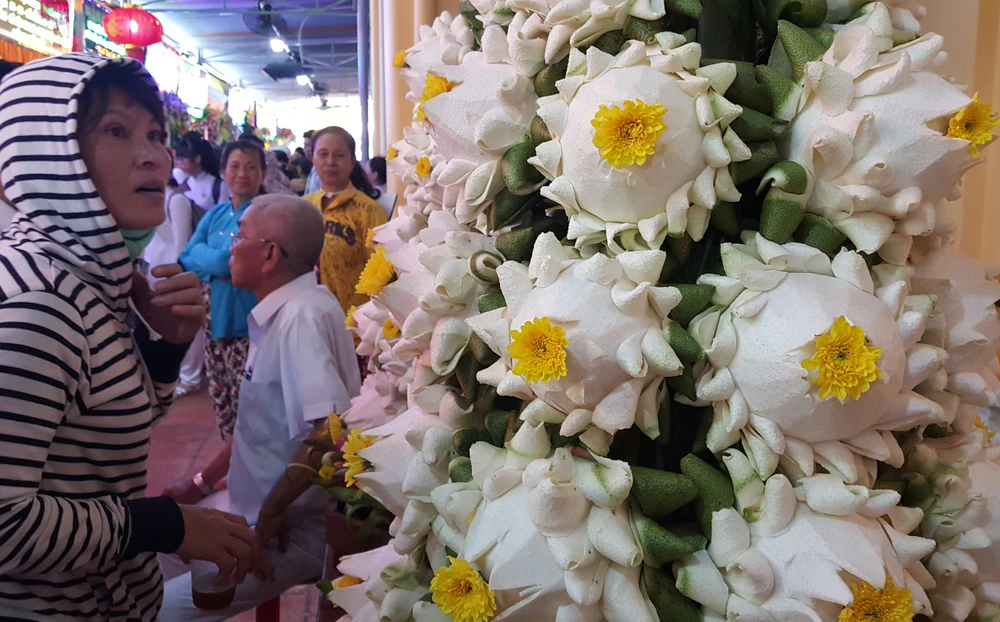 Hoa sen tạo tác từ bưởi do các tín đồ ở Đồng Nai mang tới.